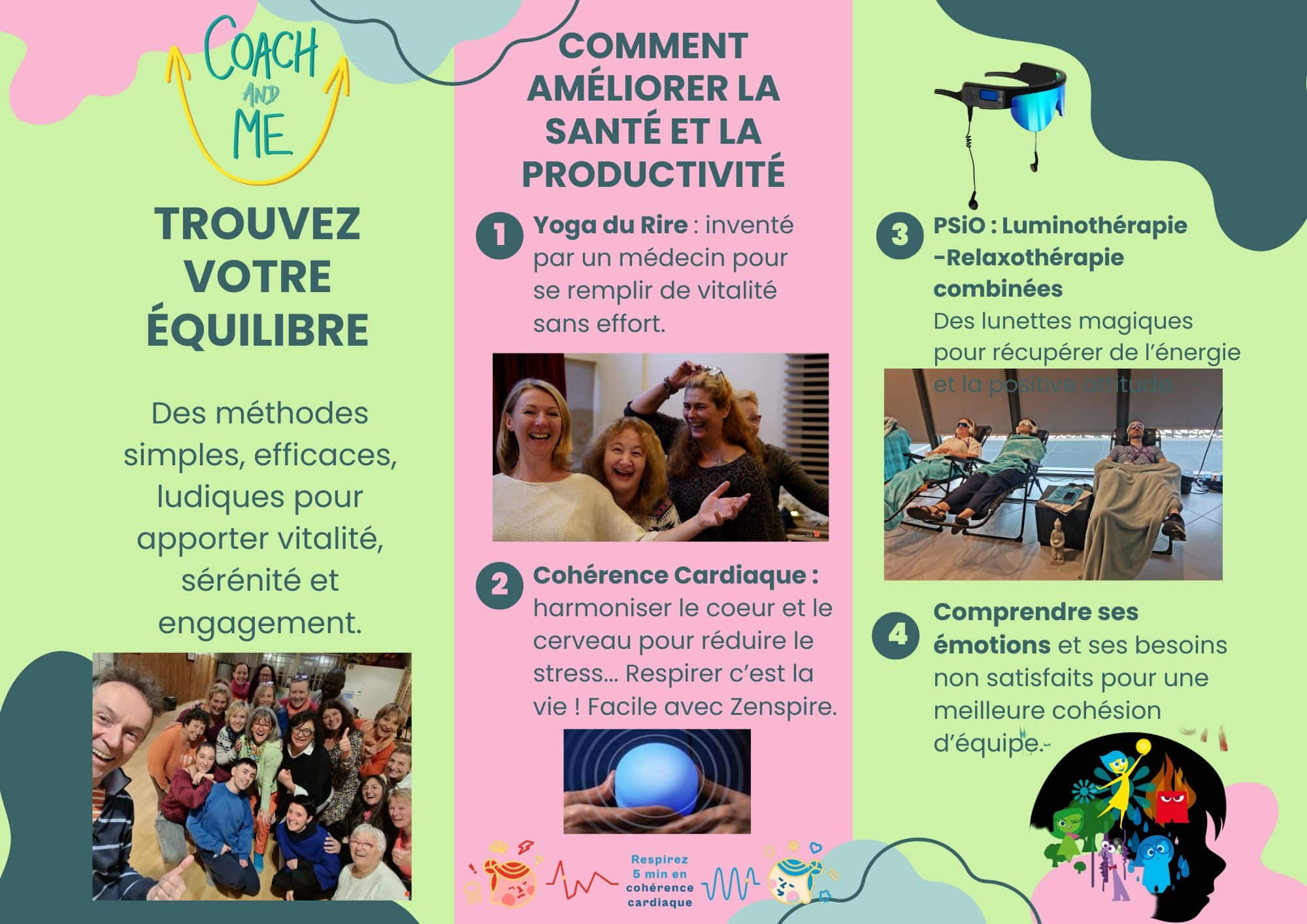 - Des solutions innovantes : Yoga du rire, Psio, cohérence cardiaque, ateliers ludiques. Une approche globale : Bien-être physique, mental et relationnel.